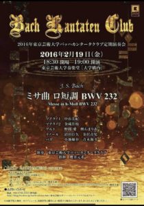 2016-02-19 2016年2月19日 2016年東京藝術大学バッハカンタータクラブ定期演奏会 2016年東京藝術大学バッハカンタータクラブ定期演奏会 ミサ曲 ロ短調 BWV232 日時 2016年2月19日(金)19:00開演 会場 東京藝術大学奏楽堂(大学構内) Home › 過去に出演した演奏会 › 2016年2月19日 2016年東京藝術大学バッハカンタータクラブ定期演奏会 関連記事 2025年11月16日 東京混声合唱団 第268回定期演奏会 水戸博之常任指揮者就任披露 2021年2月20日 ガラコン&愛の妙薬 2024年4月24日 東混ゾリステン アフタヌーン・コンサートin流山 2018年12月8日 OPERALMA 第1回公演 ドニゼッティ作曲《ランメルモールのルチア》 2023年1月22日 Deutsche Oper U 第1回公演 モーツァルト作曲 歌劇「魔笛」 2016年2月16日 声楽演習Ⅲ2015年度後期発表会 2016年3月5日 W.A.Mozart Opera《Don Giovanni》