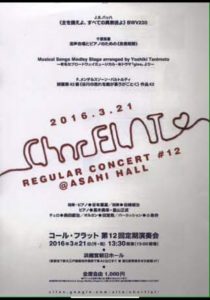 2016-03-21 2016年3月21日 コール・フラット 第12回定期演奏会 コール・フラット 第12回定期演奏会 日時 2016年3月21日(月・祝)13:30開演 会場 浜離宮朝日ホール Home › 過去に出演した演奏会 › 2016年3月21日 コール・フラット 第12回定期演奏会 関連記事 2022年8月21日 歌曲個展シリーズ+1 2019年12月15日 クリスマスコンサート 2018年3月4日 ヴォクスマーナ 第39回定期演奏会 2019年2月19日 Alban Berg WOZZECK 2022年4月10日 歌曲個展シリーズ5 シューベルト歌曲個展 第1回 2016年3月5日 W.A.Mozart Opera《Don Giovanni》 2016年3月25日 harmonia ensemble 第7回定期演奏会 F.プーランク 無伴奏宗教曲全曲演奏会