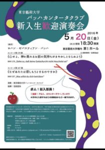 2016-05-20 2016年5月20日 東京藝術大学バッハカンタータクラブ 新入生歓迎演奏会 東京藝術大学バッハカンタータクラブ 新入生歓迎演奏会 日時 2016年5月20日(金)18:30開演 会場 東京藝術大学構内 第1ホール Home › 過去に出演した演奏会 › 2016年5月20日 東京藝術大学バッハカンタータクラブ 新入生歓迎演奏会 関連記事 2016年11月23日 harmonia ensemble 第1回国際合唱フェスティバル 2021年11月23日 オペラ団体ABQ旗揚げ公演 《信じること、その値段は》 2024年11月29日 塔の乙女 2025年11月1日 所沢混声合唱団 第18回定期演奏会 2025年3月20日 東京混声合唱団ハストピア特別公演 2016年5月5日 第7回おおいた新人演奏会 2016年5月22日 放送150回記念 スペシャルコンサート 日本名曲アルバム