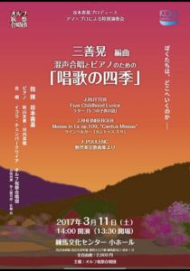 2017-03-11 2017年3月11日 オルフ祝祭合唱団「唱歌の四季」 オルフ祝祭合唱団「唱歌の四季」 日時 2017年3月11日(土)14:00開演 会場 練馬文化センター 小ホール Home › 過去に出演した演奏会 › 2017年3月11日 オルフ祝祭合唱団「唱歌の四季」 関連記事 2025年10月9日 Meet up with TOKON Vol.2 2017年6月19日 オペラコンサート~歌と朗読で送る「セビリアの理髪師」 2024年11月29日 塔の乙女 2025年3月20日 東京混声合唱団ハストピア特別公演 2021年11月15日 ラター「グローリア」、モーツァルト「レクイエム」、デュリュフレ「レクイエム」18時45分の部 2017年2月28日 harmonia ensemble 第10回定期演奏会 女性作曲家の饗宴 2017年3月12日 心に花を咲かせよう