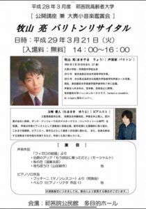 2017-03-21 2017年3月21日 牧山亮 バリトンリサイタル 牧山亮 バリトンリサイタル 日時 2017年3月21日(火)14:00開演 会場 祁答院公民館 多目的ホール Home › 過去に出演した演奏会 › 2017年3月21日 牧山亮 バリトンリサイタル 関連記事 2022年11月5日 エクス・ノーヴォVol.16 古楽アンサンブル エクス・ノーヴォ シアターX提携公演 19時00分の部 2017年10月7日 第63回 藝大オペラ定期公演 フィガロの結婚 2025年5月4日 ラ・フォル・ジュルネTOKYO2025 「嗚呼倫敦!この地で育まれたヘンデルの典雅を愉しむ」 2016年12月22日 第66回チャリティーコンサート ヘンデル《メサイア》 2025年2月20日 東混ゾリステン アフタヌーン・コンサートVol.3 2017年3月20日 harmonia ensemble 第11回定期演奏会 ドイツロマン派宗教音楽の夕べ 2017年3月28日 2017 SPRING Seminar