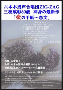 2023-02-28 2023年2月28日 六本木男声合唱団ZIG-ZAG 三枝成彰80歳 渾身の最新作「愛の手紙~恋文」 六本木男声合唱団ZIG-ZAG 三枝成彰80歳 渾身の最新作「愛の手紙~恋文」 日時 2023年2月28日(火)19:00開演 会場 サントリーホール Home › 過去に出演した演奏会 › 2023年2月28日 六本木男声合唱団ZIG-ZAG 三枝成彰80歳 渾身の最新作「愛の手紙~恋文」 関連記事 2020年8月8日 IL GORILLA 1st Concert 2025年2月11日 コーンポケット2nd Concert 2024年6月6日 山田和樹監修「未来へのメッセージ」東混ゾリステンコンサート 2019年11月7日 藝大生による木曜コンサート「作曲」 2017年5月14日 大宮ユースシンフォニーオーケストラ 第13回定期演奏会 2023年2月26日 ドン・パスクワーレ 2023年3月11日 歌曲個展シリーズ7 シューベルト歌曲個展 第2回