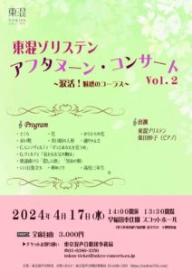 2024-04-17 2024年4月17日 東混ゾリステン アフタヌーン・コンサート Vol.2 東混ゾリステン アフタヌーン・コンサート Vol.2 ~涙活!魅惑のコーラス~ 日時 2024年4月17日(水)14:00開演 会場 早稲田奉仕園 スコットホール Home › 過去に出演した演奏会 › 2024年4月17日 東混ゾリステン アフタヌーン・コンサート Vol.2 関連記事 2023年2月10日 オペラ《愛の妙薬》 2025年3月20日 東京混声合唱団ハストピア特別公演 2015年9月21日 相澤直人作品個展 Vol.1 2016年10月16日 バッハカンタータクラブ音楽讃美夕礼拝 2017年7月14日 声楽演習Ⅲ2017年度前期発表会 ロシア歌曲の夕べ 2024年3月24日 坂口真由 ソプラノ・リサイタル 2024年4月21日 白河市コミネス混声合唱団 第1回演奏会