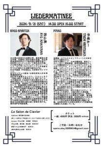 2024-09-21 2024年9月21日 歌曲個展シリーズ+6 LIEDERMATINEE 歌曲個展シリーズ+6 LIEDERMATINEE 日時 2024年9月21日(土)15:00開演 会場 Le Salon de Clavier Home › 過去に出演した演奏会 › 2024年9月21日 歌曲個展シリーズ+6 LIEDERMATINEE 関連記事 2016年1月26日 Az Singers 公開収録 2024年5月4日 團伊玖磨生誕100年記念コンサート 2025年1月22日 東混ってなんなん? 2022年9月23日 歌曲個展シリーズ+2 ウィーンに想いを馳せて 14時の部 2021年3月22日 歌曲個展シリーズ2 ショスタコーヴィチ歌曲個展 第1回 2024年8月31日 東京混声合唱団特別演奏会 東混オールスターズ 2024年10月1日~21日 東京混声合唱団 ヨーロッパ公演