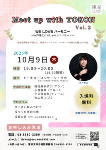2025-10-09 2025年10月9日 Meet up with TOKON Vol.2 Meet up with TOKON Vol.2 日時 2025年10月9日(木)19:00開演 会場 トーキョーコンサーツ・ラボ Home › 過去に出演した演奏会 › 2025年10月9日 Meet up with TOKON Vol.2 関連記事 2021年2月14日 Il Gorilla 3rd コンサート イル・ゴリッラ 新時代の幕開け 2024年5月4日 團伊玖磨生誕100年記念コンサート 2020年8月1日 パリ狂騒の時代とユーラシアの風 2025年1月22日 東混ってなんなん? 2025年12月24日 歌曲個展シリーズ11 ショスタコーヴィチ歌曲個展 第3回 -没後50年に寄せて- 2025年9月23日 東京混声合唱団 特別演奏会 信長貴富+東混 Sing!NOBUNAGA 2025年10月12日 東京混声合唱団 真庭エスパス特別演奏会