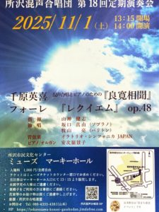 2025-11-01 2025年11月1日 所沢混声合唱団 第18回定期演奏会 所沢混声合唱団 第18回定期演奏会 日時 2025年11月1日(土)14:00開演 会場 所沢市民文化センター ミューズ マーキーホール Home › 過去に出演した演奏会 › 2025年11月1日 所沢混声合唱団 第18回定期演奏会 関連記事 2024年7月27日 市制施行70周年・サッカーのまち100周年 歌うまちふじえだ♪合唱祭 2022年11月5日 エクス・ノーヴォVol.16 古楽アンサンブル エクス・ノーヴォ シアターX提携公演 19時00分の部 2019年2月1日 文化庁芸術祭新人賞受賞記念 若林かをり フルーティッシモ! plus 2019年4月13日 東京藝術大学音楽学部 同声会新人演奏会 2016年12月23日 harmonia ensemble 4th Christmas Concert 2025年10月17日 東京混声合唱団 アフタヌーン・コンサート atアプリコ 2025年11月16日 東京混声合唱団 第268回定期演奏会 水戸博之常任指揮者就任披露