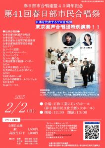 2025-02-02 2025年2月2日 春日部市合唱連盟40周年記念 第41回春日部市民合唱祭 春日部市合唱連盟40周年記念 第41回春日部市民合唱祭 日時 2025年2月2日(日)13:00開演 会場 正和工業にじいろホール (春日部市民文化会館・大ホール) Home › 過去に出演した演奏会 › 2025年2月2日 春日部市合唱連盟40周年記念 第41回春日部市民合唱祭 関連記事 2016年11月22日 harmonia ensemble 第1回国際合唱フェスティバル 2017年9月10日 藝祭2017演奏企画 モンテヴェルディ マドリガーレ集 2025年2月11日 コーンポケット2nd Concert 2021年2月20日 ガラコン&愛の妙薬 2019年4月6日 モーツァルト コジ・ファン・トゥッテ 2025年2月1日 りゅーとぴあヴァレンタイン・コンサート 東京混声合唱団アンサンブル 2025年2月8日 東京混声合唱団 第267回定期演奏会