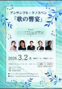 2026-01-11 2026年3月2日 アンサンブル・クノスペン「歌の饗宴」 アンサンブル・クノスペン 「歌の饗宴」 日時 2026年3月2日(月)19:00開演 会場 すみだトリフォニーホール 小ホール Home › 演奏会 › 2026年3月2日 アンサンブル・クノスペン「歌の饗宴」 関連記事 2026年1月24日 東京混声合唱団 第269回 定期演奏会 「田中祐子と東混・合唱の夢」 2026年4月18日 合唱団ABQ 第1回定期演奏会 2026年3月15日 東京混声合唱団 池田特別演奏会 2026年3月14日 東京混声合唱団 三原特別演奏会 2026年2月27日 東京混声合唱団 第270回定期演奏会 2026年4月18日 合唱団ABQ 第1回定期演奏会