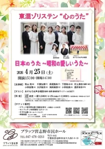2026-03-23 2026年4月25日 東混ゾリステン“心のうた” 東混ゾリステン“心のうた” 日時 2026年4月25日(土)15:00開演 会場 プラッツ習志野市民ホール Home › 演奏会 › 2026年4月25日 東混ゾリステン“心のうた” 関連記事 2026年4月26日 東京混声合唱団ギャラクシティ特別演奏会 2026年5月17日 團伊玖磨と久留米 メモリアルコンサート 2026年7月3日 合唱団オラショクラブ第10回演奏会 2026年4月19日 白河市コミネス混声合唱団 第2回演奏会 2026年6月27日 東京混声合唱団 平塚特別演奏会 2026年7月11日 歌曲個展シリーズ12 ヴォルフ歌曲個展 Vol.2 2026年7月3日 合唱団オラショクラブ第10回演奏会