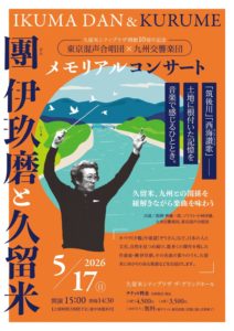 2026-03-29 2026年5月17日 團伊玖磨と久留米 メモリアルコンサート 團伊玖磨と久留米 メモリアルコンサート 日時 2026年5月17日(日)15:00開演 会場 久留米シティプラザ ザ・グランドホール Home › 演奏会 › 2026年5月17日 團伊玖磨と久留米 メモリアルコンサート 関連記事 2026年4月18日 合唱団ABQ 第1回定期演奏会 2026年4月19日 白河市コミネス混声合唱団 第2回演奏会 2026年4月25日 東混ゾリステン“心のうた” 2026年5月10日 山田和樹&東京芸術劇場 交響都市計画 《交響的変容》 2026年6月27日 東京混声合唱団 平塚特別演奏会 2026年7月3日 合唱団オラショクラブ第10回演奏会